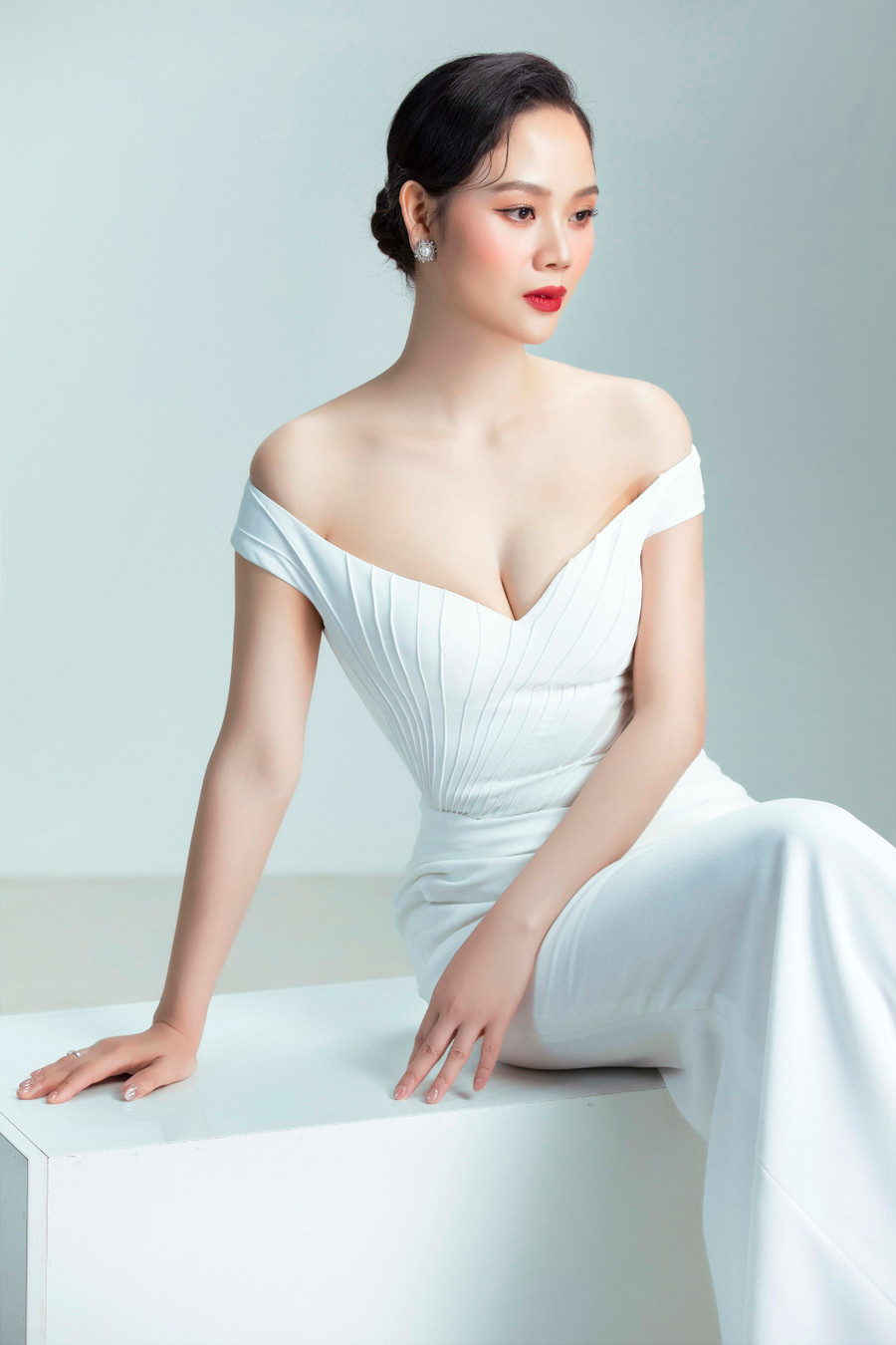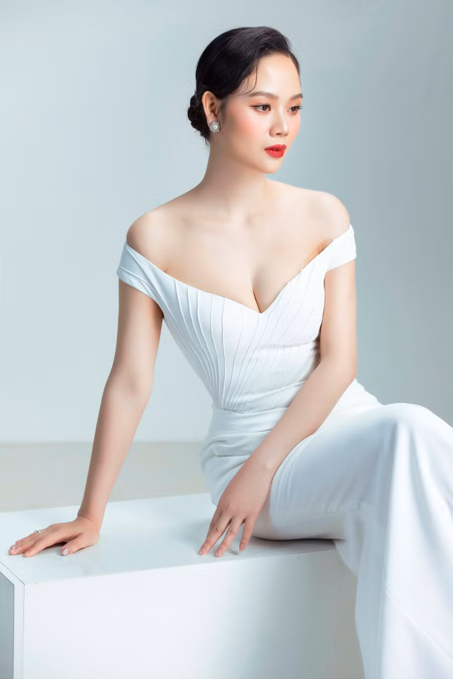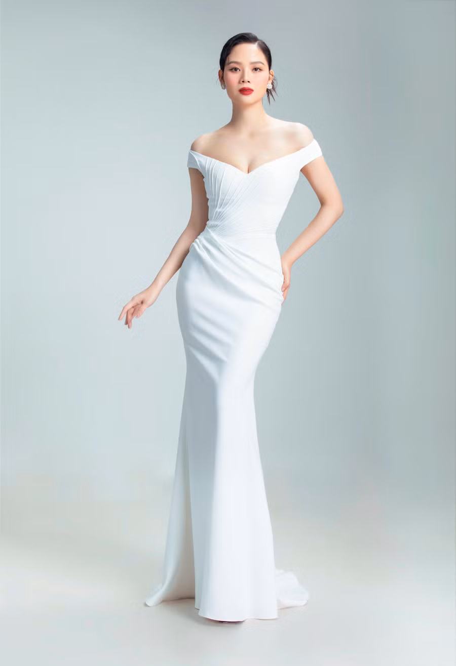 Các thiết kế có chi tiết trễ vai hay cúp ngực khoe khéo bờ xương quai xanh cuốn hút và cũng là thế mạnh của Mai Phương.
