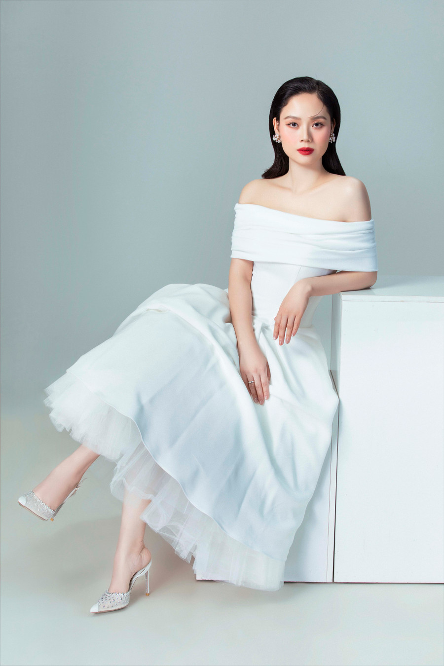 Ngoài trang phục đơn sắc, thiết kế có gam màu tương phản giúp làm nổi bật làn da trắng hồng rạng rỡ của Mai Phương.