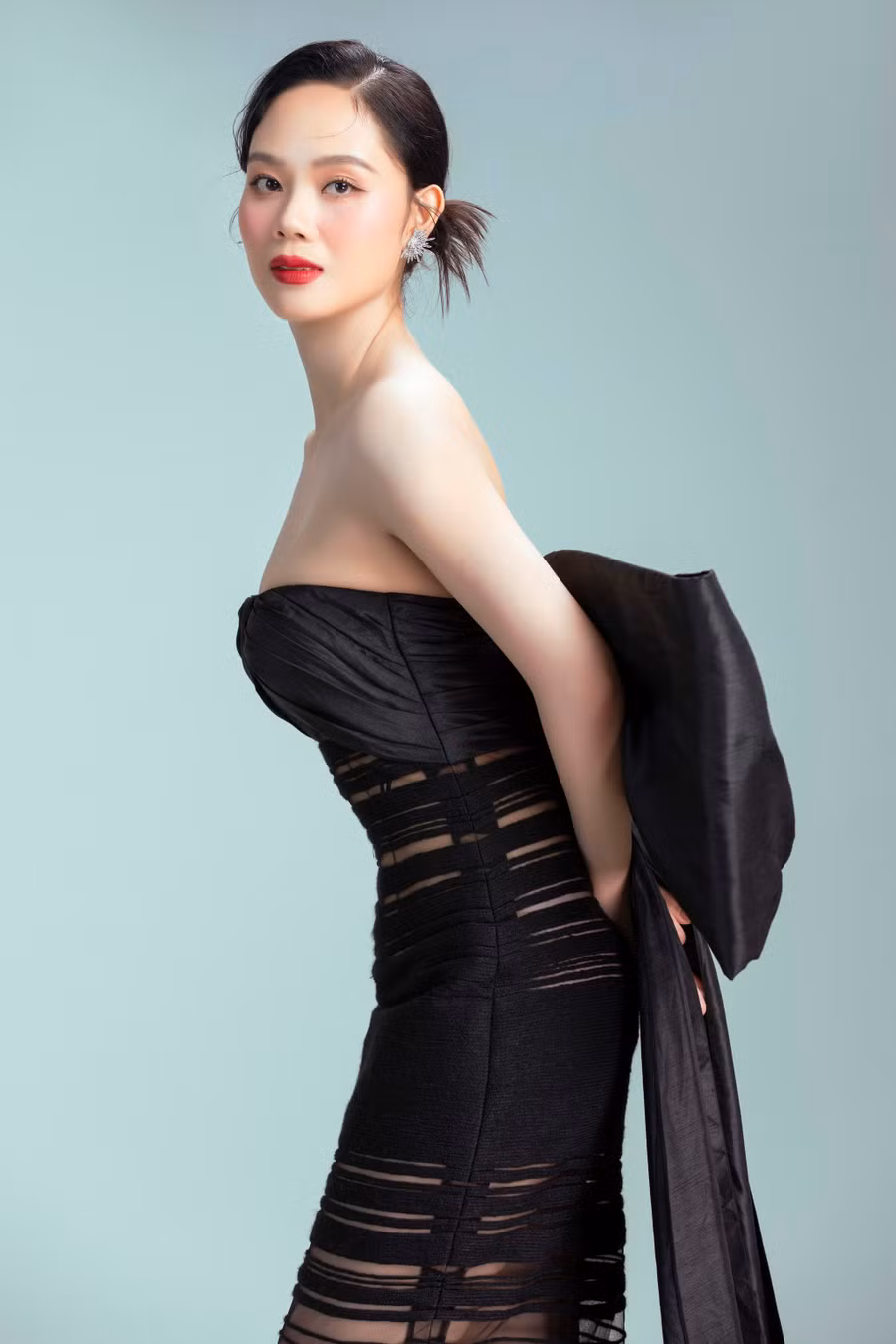 Đầm cúp ngực với các khoảng hở xuyên thấu khoe vóc dáng quyến rũ của nàng hậu, chi tiết nơ to bản tạo hình ảnh ấn tượng và thướt tha.