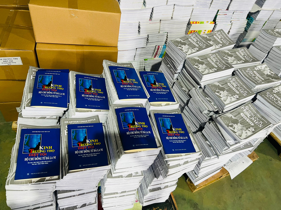 Tại đây, lực lượng chức năng phát hiện cơ sở đang tổ chức in 3.000 bản “Kinh Trường thọ diệt tội” (ghi NXB Tôn Giáo); 9.000 bản ấn phẩm “Sherlock Holmes” (ghi NXB Hội Nhà văn) với tổng số hơn 10 tấn sách bán thành phẩm đều không có quyết định xuất bản của cơ quan có thẩm quyền.