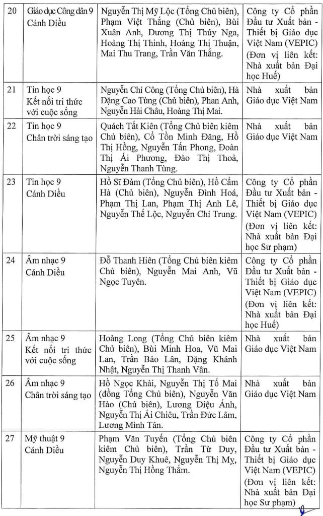 Theo quyết định có tổng cộng 48 sách giáo khoa lớp 9 được phê duyệt gồm: 3 sách giáo khoa Ngữ văn (tập 1 và tập 2), 4 sách giáo khoa Toán (tập 1 và tập 2), 9 sách giáo khoa Tiếng Anh, 2 sách Lịch sử-Địa lý, 2 sách Giáo dục công dân, 3 sách giáo khoa Tin học, 3 sách Âm nhạc, 4 sách giáo khoa Mỹ thuật, 3 sách giáo khoa Giáo dục thể chất, 11 sách giáo khoa môn Công nghệ và 4 sách hoạt động trải nghiệm và hướng nghiệp.