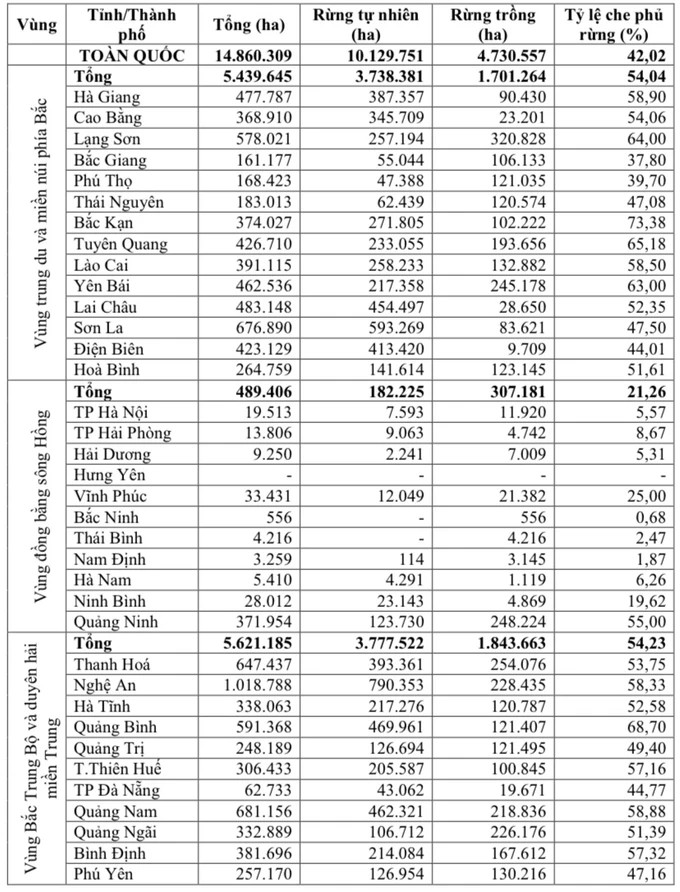 | Diện tích rừng và tỷ lệ che phủ tại từng vùng miền, địa phương. Nguồn: Bộ NN-PTNT công bố ngày 20-3-2024 |