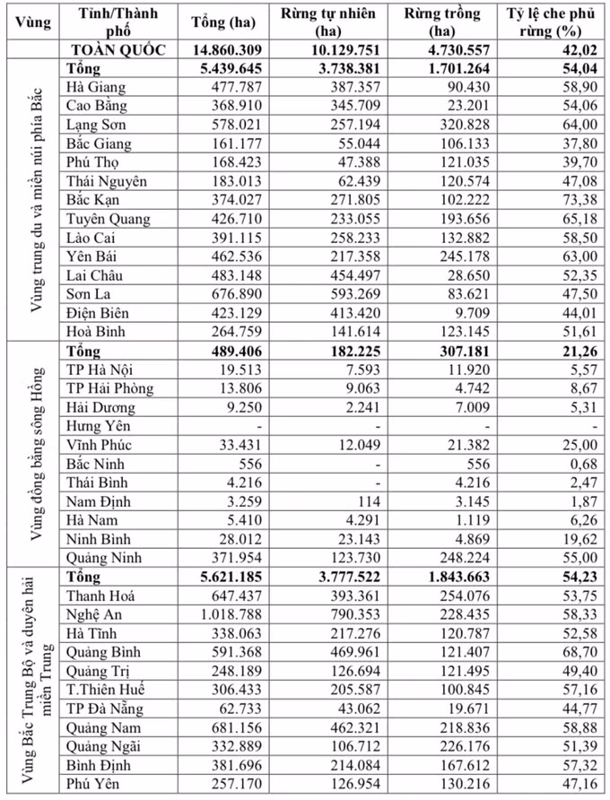 Tổng diện tích rừng (gồm cả phần diện tích rừng chưa đủ tiêu chí tính tỷ lệ che phủ) là: 14.860.309ha (trong đó, rừng tự nhiên là 10.129.751ha, còn lại là rừng trồng). Tuy nhiên, nếu chỉ tính diện tích rừng đã đủ tiêu chí tính tỷ lệ che phủ thì cả nước có: 13.927.122ha với tỷ lệ che phủ rừng toàn quốc: 42,02%.