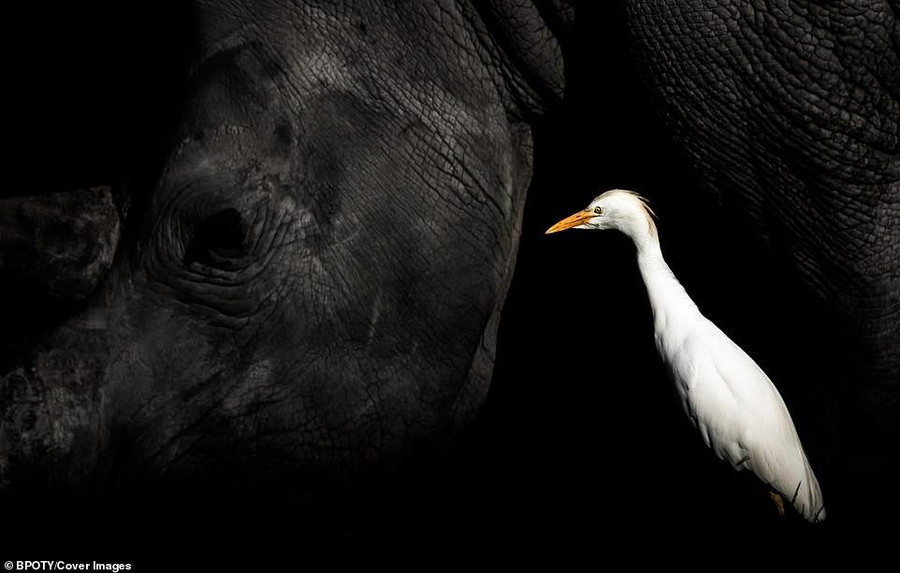 Nhiếp ảnh gia William Steel chụp lại ảnh con cò đang kiếm ăn cạnh một con tê giác ở Botswana. Tác phẩm đã giành giải đồng hạng mục ảnh Chân dung. Sự thờ ơ, vô tình cùng tông màu trắng đen của con tê giác đối với nhân vật thứ hai trong hình mang đến sự tương phản lớn về thị giác.