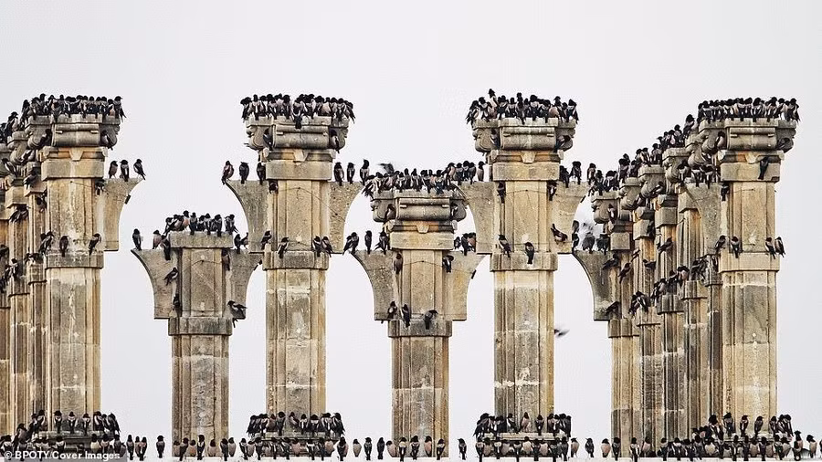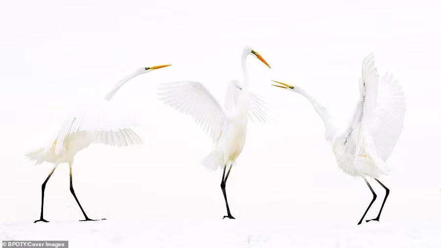 Nhiếp ảnh gia Bence Mate, người Hungary, đã nhận được giải bạc ở hạng mục Hành vi của loài chim. Mate cho biết để chụp được bức ảnh bầy cò trên tuyết đẹp tuyệt vời này, anh đã phải lên kế hoạch trong 10 năm.