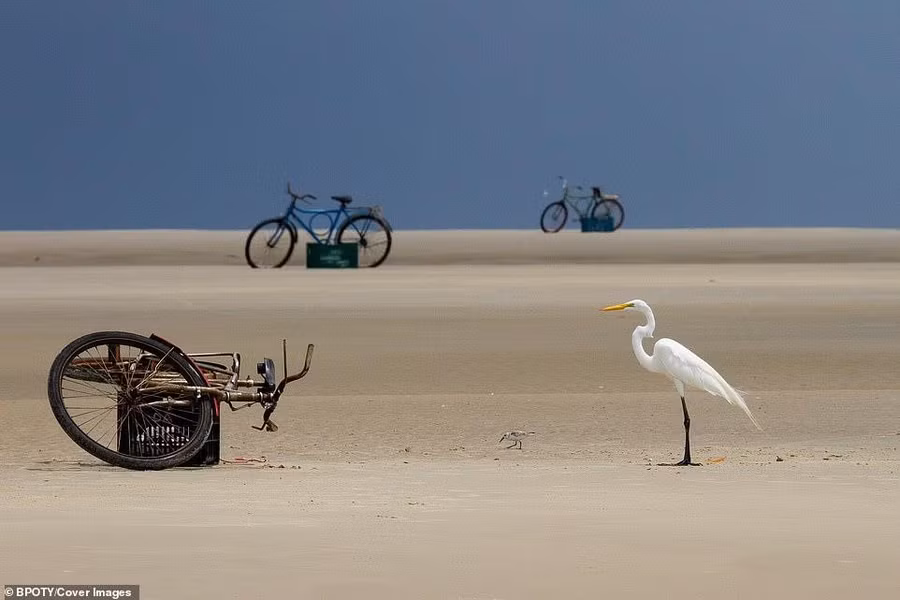 Bức ảnh được chụp tại bang Maranhao của Brazil đã mang về cho nhiếp ảnh gia Mark Peck, người Canada, giải bạc ở hạng mục Môi trường. Anh cho biết: "Trước khi cơn bão ập đến, tôi quay lại trại nghiên cứu chim biển của mình. Tại đây, các ngư dân thường đạp xe đi dọc bờ biển để kiểm tra lưới và cho cá vào giỏ xe. Tôi may mắn chụp được cảnh con cò đang kiên nhẫn chờ đợi người ngư dân mang cá quay lại để xin phần".