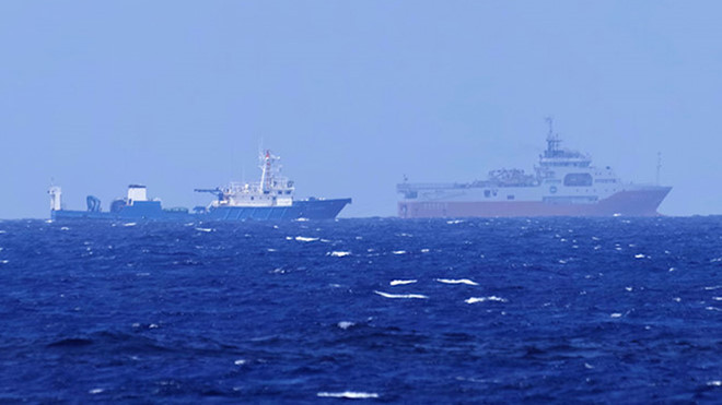 Tàu hải cảnh Trung Quốc hộ tống tàu Hải Dương địa chất 8 hoạt động trái phép trên vùng biển Việt Nam hồi tháng 7 năm ngoái. ẢNH DO NGƯ DÂN CUNG CẤP