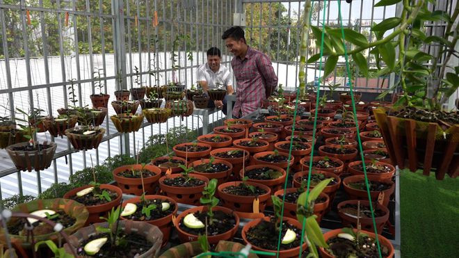 Chỉ với diện tích 200 m2, nhưng vườn lan được đầu tư vô cùng bài bản. Bên trong vườn lan được thiết kế 2 tầng, tầng trên trồng lan đột biến, tầng dưới chủ yếu để ươm giống. Ngoài ra, vườn được lắp đặt hệ thống tưới nước tự động, máy đo độ ẩm, nhiệt độ, camera theo dõi...