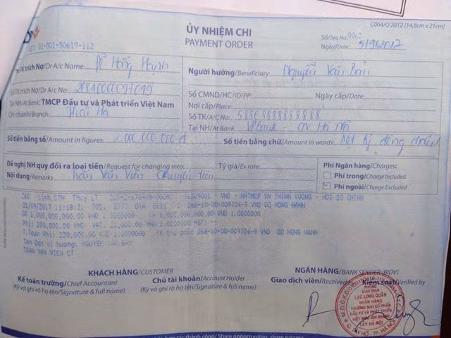 Một uỷ nhiệm chi tiền tỷ được gửi tới cán bộ Tổng cục Biển và Hải đảo Việt Nam (Ảnh: BVPL).