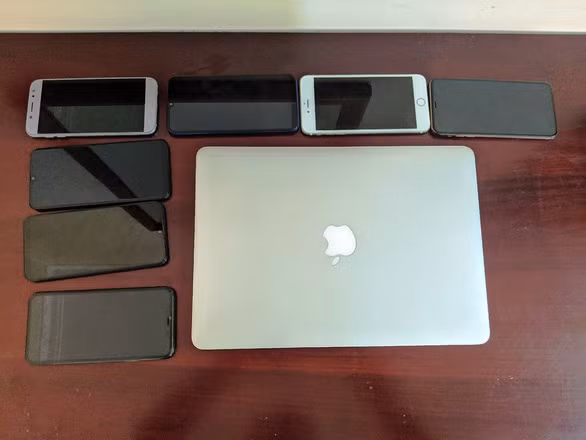 Điện thoại, máy tính công an thu giữ của các đối tượng - Ảnh: CA cung cấp