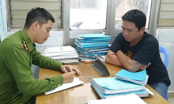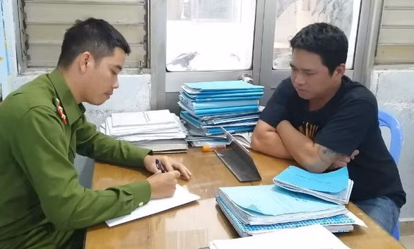 Công an làm việc với một người liên quan đường dây đánh bạc qua mạng - Ảnh: CA