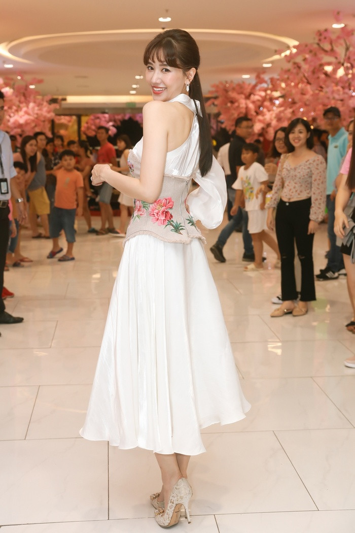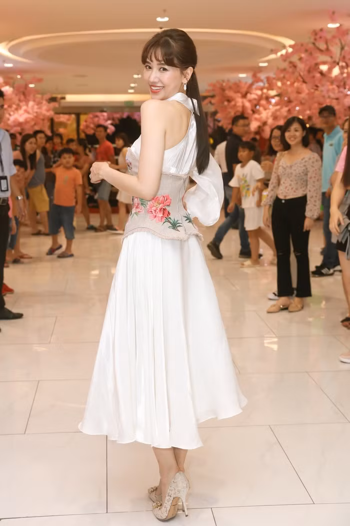 Tối 3/11, cô nàng lần nữa khiến khán giả mê mẩn khi xuất hiện tại một sự kiện. Chọn cho mình bộ váy bất đối xứng trắng tinh khôi, nhưng chính việc mix cùng corset ôm sát vừa tạo điểm nhấn, vừa khoe được vòng eo thon thả của mỹ nhân.