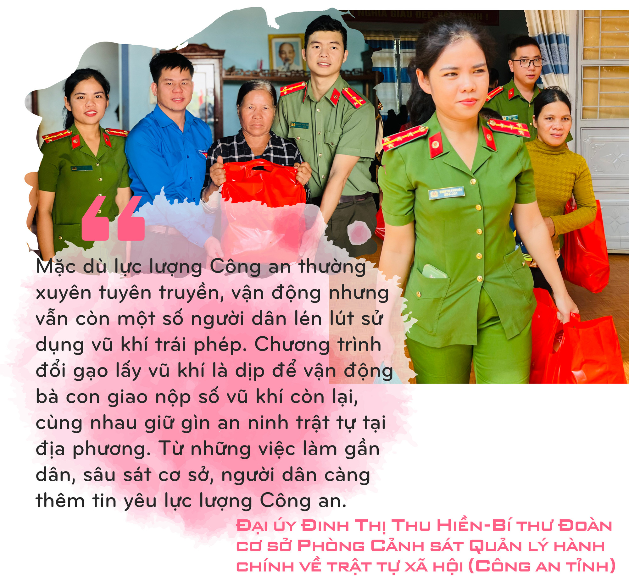 Mới đây, chúng tôi có dịp tham gia chương trình “Đổi gạo lấy vũ khí, vật liệu nổ, công cụ hỗ trợ và pháo” do Phòng Cảnh sát Quản lý hành chính về trật tự xã hội phối hợp cùng Công an huyện Mang Yang và các Mạnh Thường Quân tổ chức tại làng Kon Chrăh, xã Hra. Trước ngày tổ chức chương trình, cán bộ, chiến sĩ Công an xã Hra cùng những người uy tín ở các làng đến từng nhà để tuyên truyền, vận động người dân tự nguyện giao nộp vũ khí. Tại chương trình, bà con được lực lượng Công an thông báo về tình hình tội phạm liên quan đến vũ khí, vật liệu nổ; cảnh báo những hậu quả nghiêm trọng từ việc tàng trữ, sử dụng vũ khí, vật liệu nổ trái phép.
