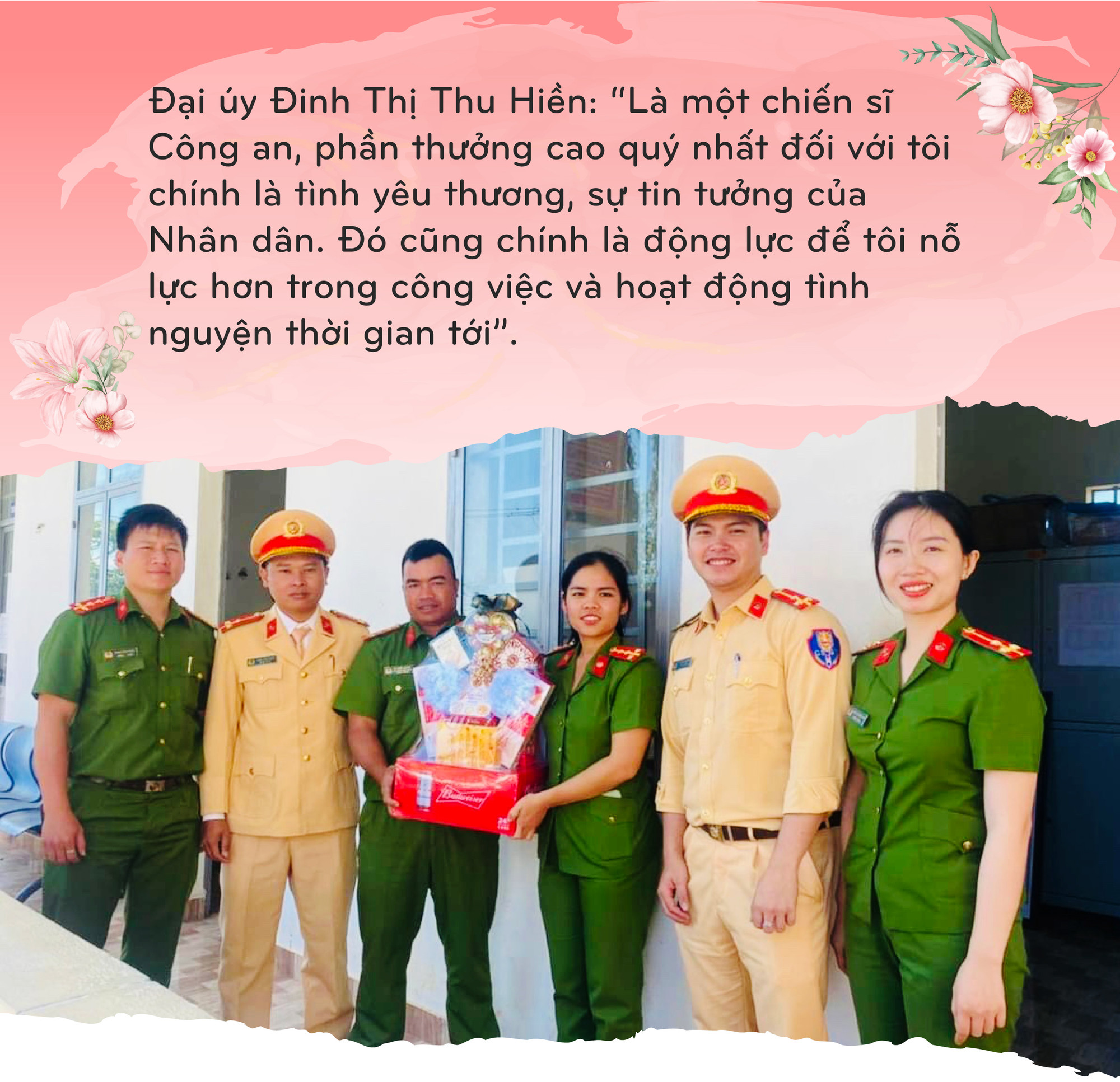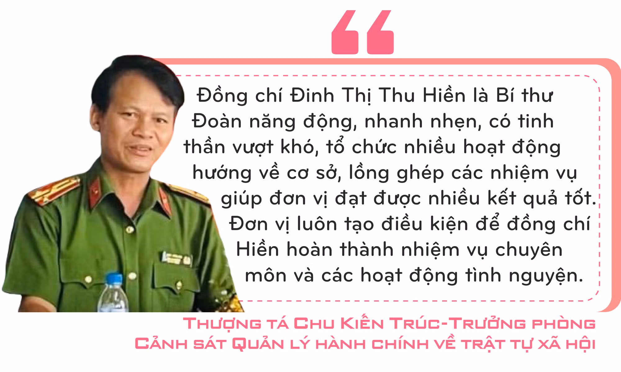 Hưởng ứng đợt thi đua cao điểm tấn công trấn áp tội phạm, đảm bảo an ninh trật tự, chị Hiền tham mưu đề xuất cấp ủy, lãnh đạo đơn vị đa dạng hình thức tuyên truyền an toàn giao thông, kích hoạt tài khoản định danh điện tử, thực hiện thủ tục hành chính trên Cổng dịch vụ công Bộ Công an.