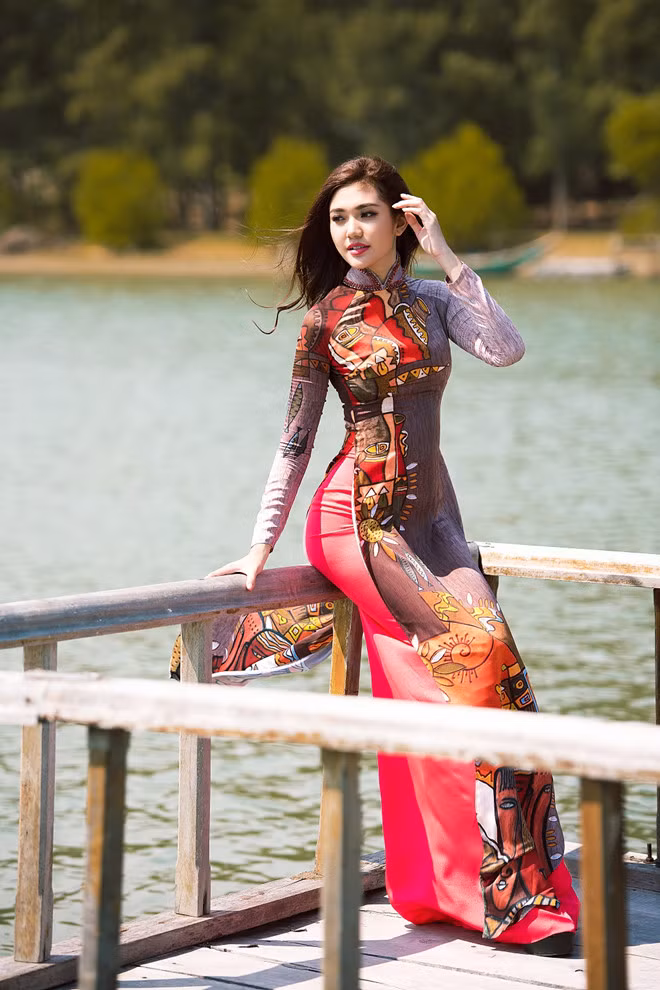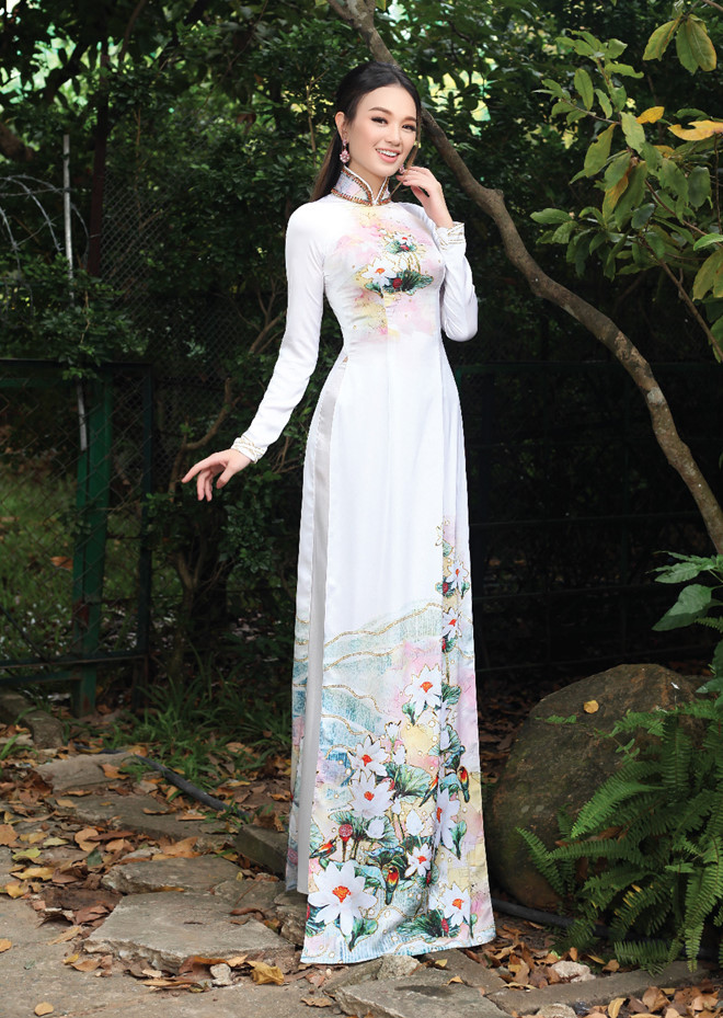 Tất cả những dấu ấn đến từ hình ảnh, màu sắc và ý nghĩa hoa văn đều được thể hiện trên nền vải mềm mại, thoáng mát. Chất liệu co giãn nhẹ tăng thêm phần thoải mái, tự tin cho người mặc trong tiết trời xuân - hè.