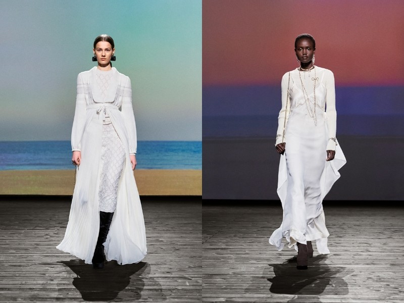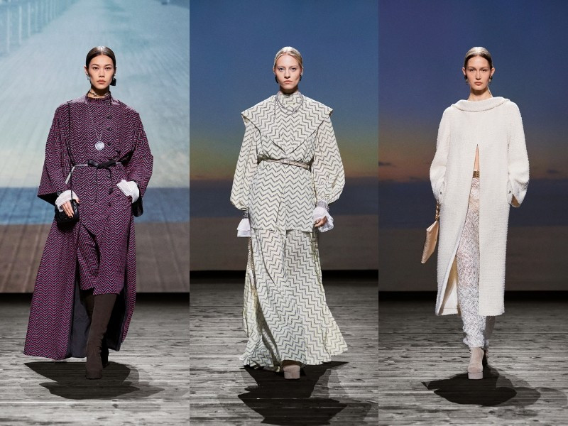 Người mẫu diện đầm và áo khoác dáng dài bay bổng, kết hợp với găng tay opera dài, vòng cổ và bốt cao đến đùi. Ở vài khoảnh khắc khác, ta lại bắt gặp bản phối cổ điển giữa áo dệt kim dài tay và chân váy voan dáng suông, độ ôm của các thiết kế làm nổi bật lên dáng vẻ yêu kiều của một quý cô sành điệu.