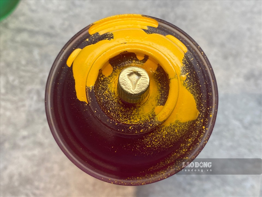 | Tác phẩm thể hiện kỹ thuật tráng men sứ thuộc bộ sưu tập “Thuật giả kim“ tượng trưng cho sự phá vỡ những giới hạn của bản thân, sẵn sàng xóa đi những cái cũ nhường chỗ cho những tư duy mới. Hiện tại, bức tranh này có giá hơn 600 triệu đồng. |