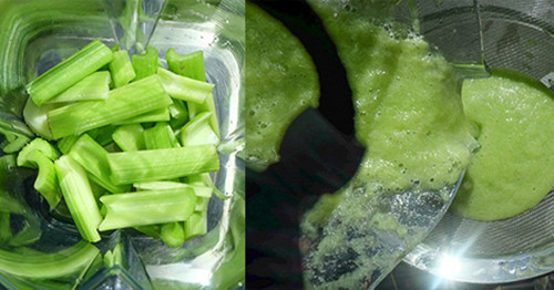 - Cần tây mang rửa sạch, nhặt bỏ phần lá, phần thân thái thành những khúc nhỏ rồi cho vào máy xay xay nhuyễn cùng với chút nước lọc.