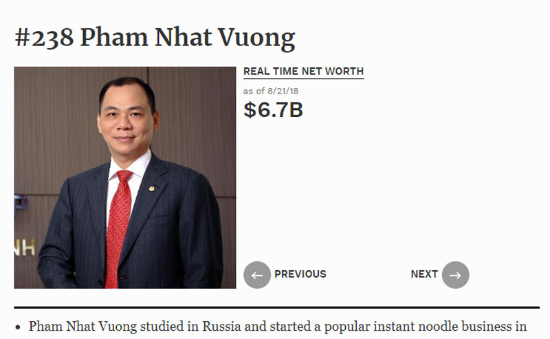 Tính theo số cổ phiếu trên sàn, ông Phạm Nhật Vượng hiện có túi tiền đạt 192 ngàn tỷ (8,1 USD). Còn theo tính toán của Forbes tới 21/8, ông Vượng có 6,7 tỷ USD, xếp thứ 238 trên thế giới.