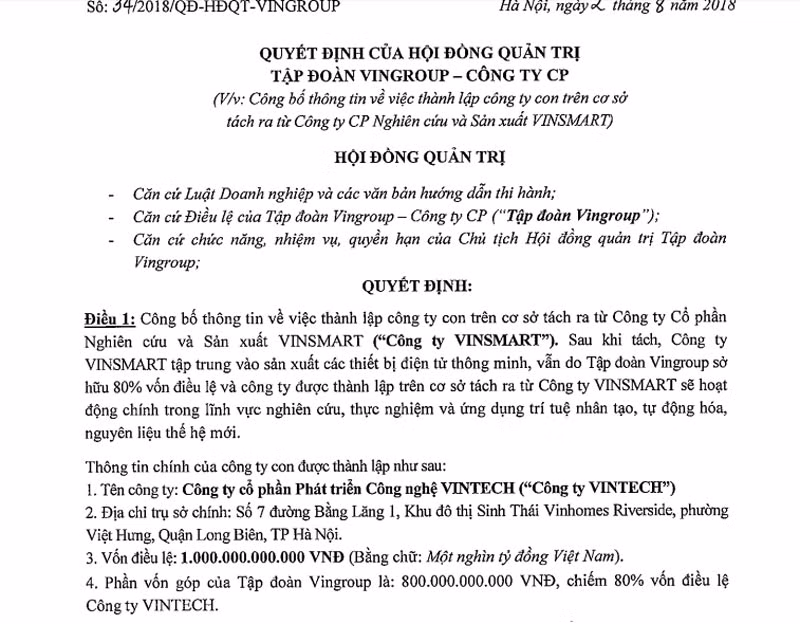 Gần đây, Vingroup cũng đã quyết định thành lập công ty con Vintech trên cơ sở tách ra từ CTCP Nghiên cứu và Sản xuất Vinsmart. Vinsmart tập trung vào sản xuất các thiết bị điện tử thông minh (Vingroup nắm 80% vốn điều lệ). Trong khi Vintech sẽ hoạt động chính trong lĩnh vực nghiên cứu, thực nghiệm và ứng dụng trí tuệ nhân tạo (AI), tự động hóa, nguyên liệu thế hệ mới.