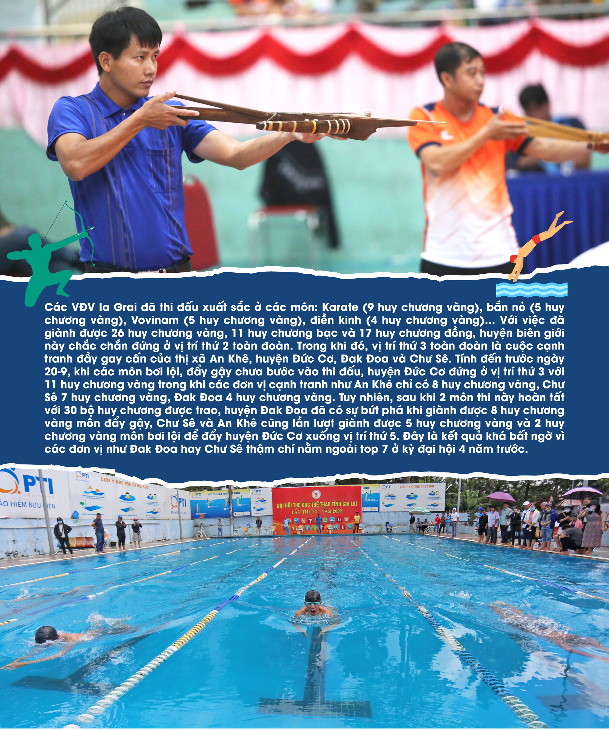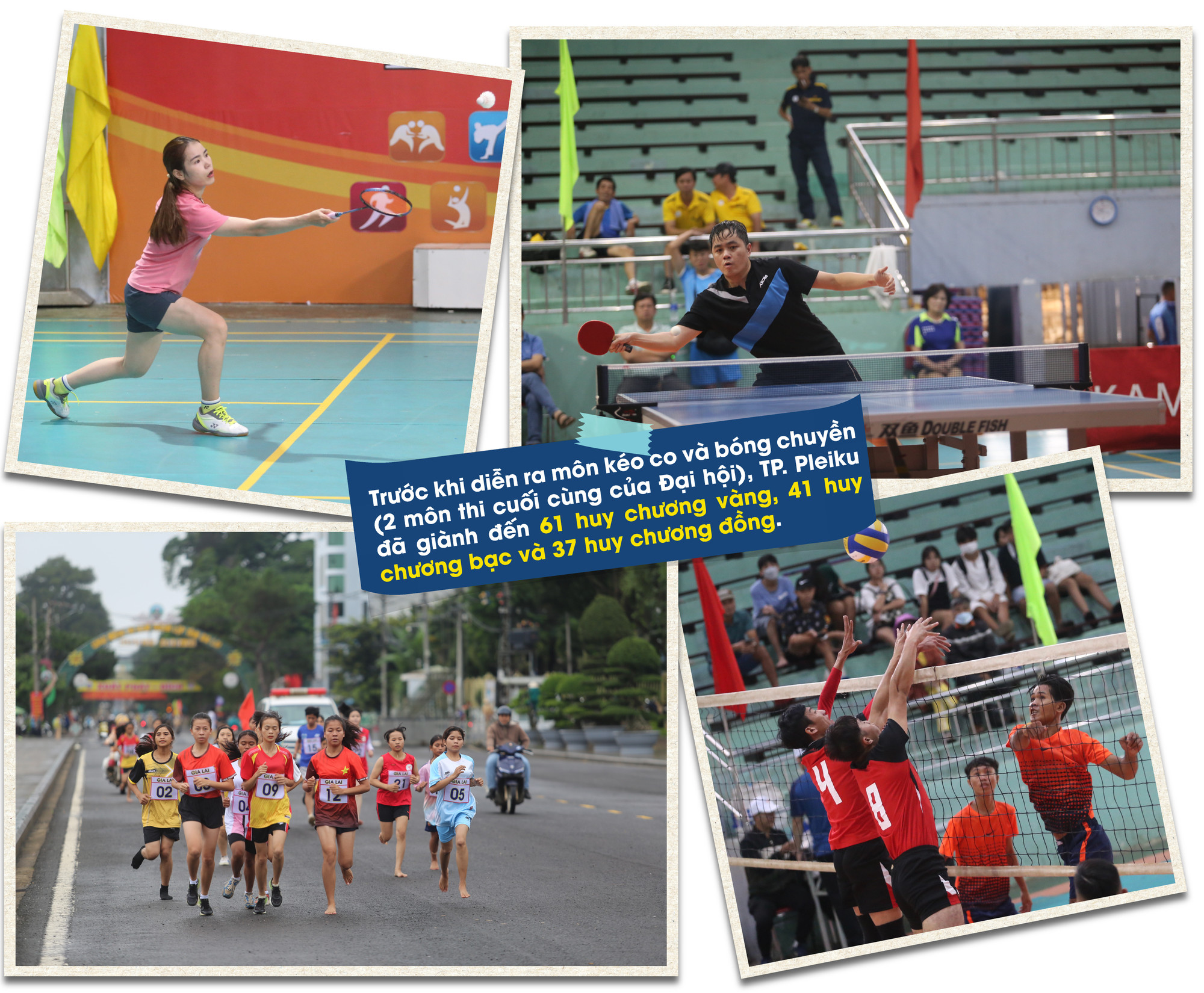 Mỗi kỳ đại hội TDTT đều chứng kiến sự quyết tâm của các đoàn VĐV để khẳng định vị thế của mình trong làng thể thao tỉnh nhà. Tại Đại hội lần thứ IX, TP. Pleiku vẫn tiếp tục khẳng định sự vượt trội so với các đoàn còn lại, đặc biệt là ở các môn võ. Cụ thể, TP. Pleiku đã giành đến 11 huy chương vàng môn Taekwondo, 7 huy chương vàng môn Vovinam và 11 huy chương vàng môn võ cổ truyền. Hay như ở môn quần vợt và bóng bàn, họ giành trọn vẹn 12/12 huy chương vàng.