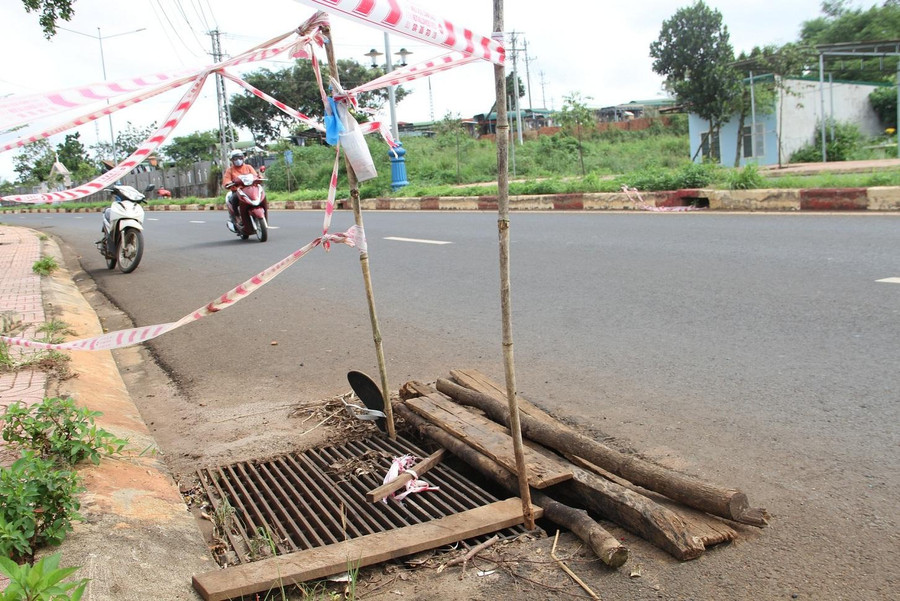 | Các hố ga mất nắp trên đường Trần Quý Cáp được che chắn sơ sài. Ảnh: Hoàng Bình |