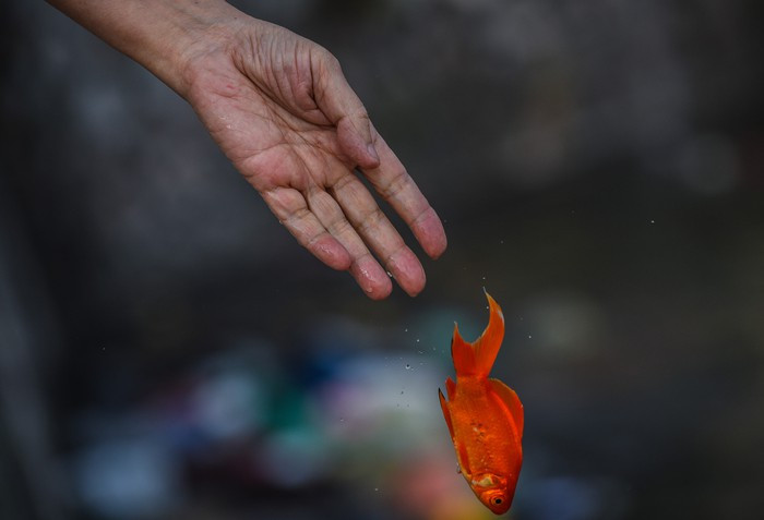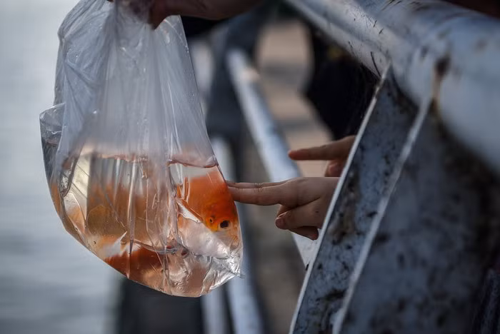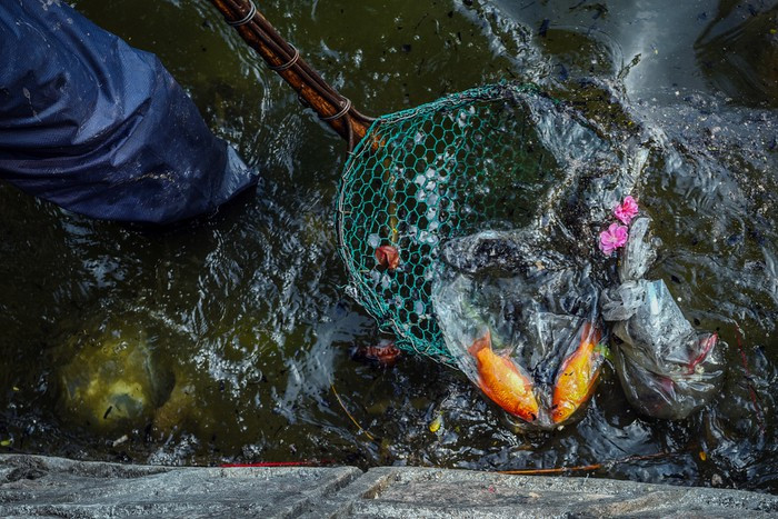 Hay bốc cá bằng tay thả xuống nước sau đó đem túi nylon về nhà tái sử dụng.