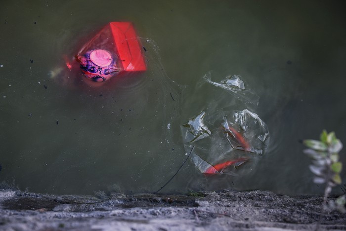 Những con cá mắc kẹt trong túi nylon dưới dòng nước bẩn bên cạnh là bát hương, đồ thờ cúng và rác thải.
