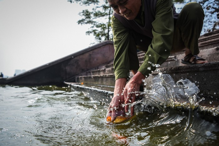 Sáng 28/1 (tức 23 tháng Chạp), tại khu vực hồ Tây (Hà Nội), nhiều người dân đi thả cá chép tiễn Táo quân chầu trời.