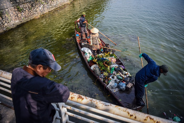 Một công nhân vệ sinh môi trường đang làm việc tại hồ Tây chia sẻ: "Những ngày cận tết, đặc biệt là ngày ông Công, ông Táo người dân ném rất nhiều loại rác xuống hồ như bàn thờ cũ, tro hóa vàng, chân hương... chúng tôi phải làm việc gấp 3 lần ngày thường mới vớt được hết rác".