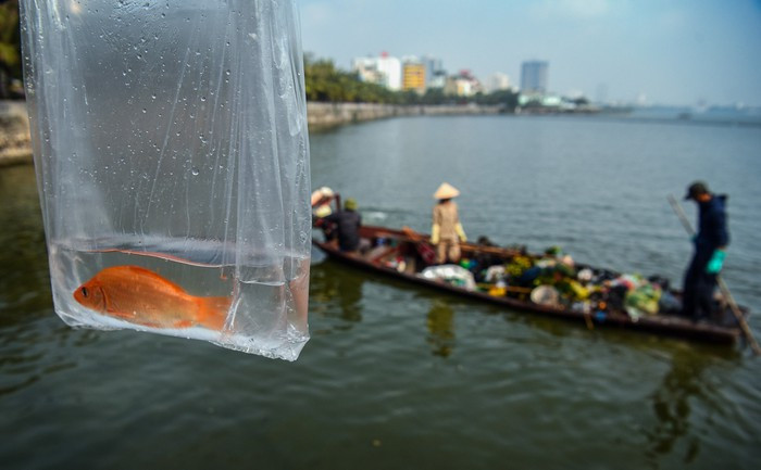 Trong ngày ông Công ông Táo, tại nhiều hồ ở Hà Nội, số lượng người dân thả cá chép ít hơn mọi năm nhưng túi nylon, tro hóa vàng bị thải ra rất nhiều.