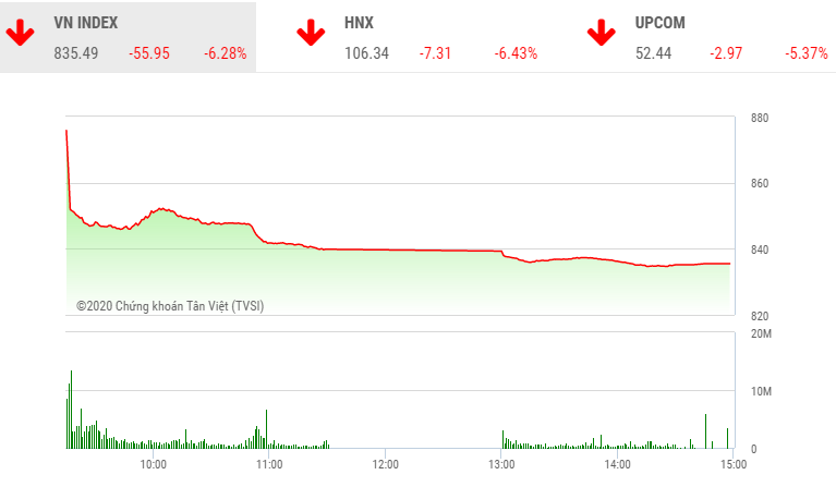 Cụ thể, VN-Index chốt phiên giảm 55,95 điểm (-6,28%) xuống 835,49 điểm, đây là mức giảm mạnh nhất trong vòng hơn 18 năm qua kể từ ngày 3/10/2001 (-6,45%). Toàn sàn có đến 368 mã giảm, trong đó có 173 mã giảm sàn, trong khi chỉ có 34 mã tăng và 14 mã đứng giá.