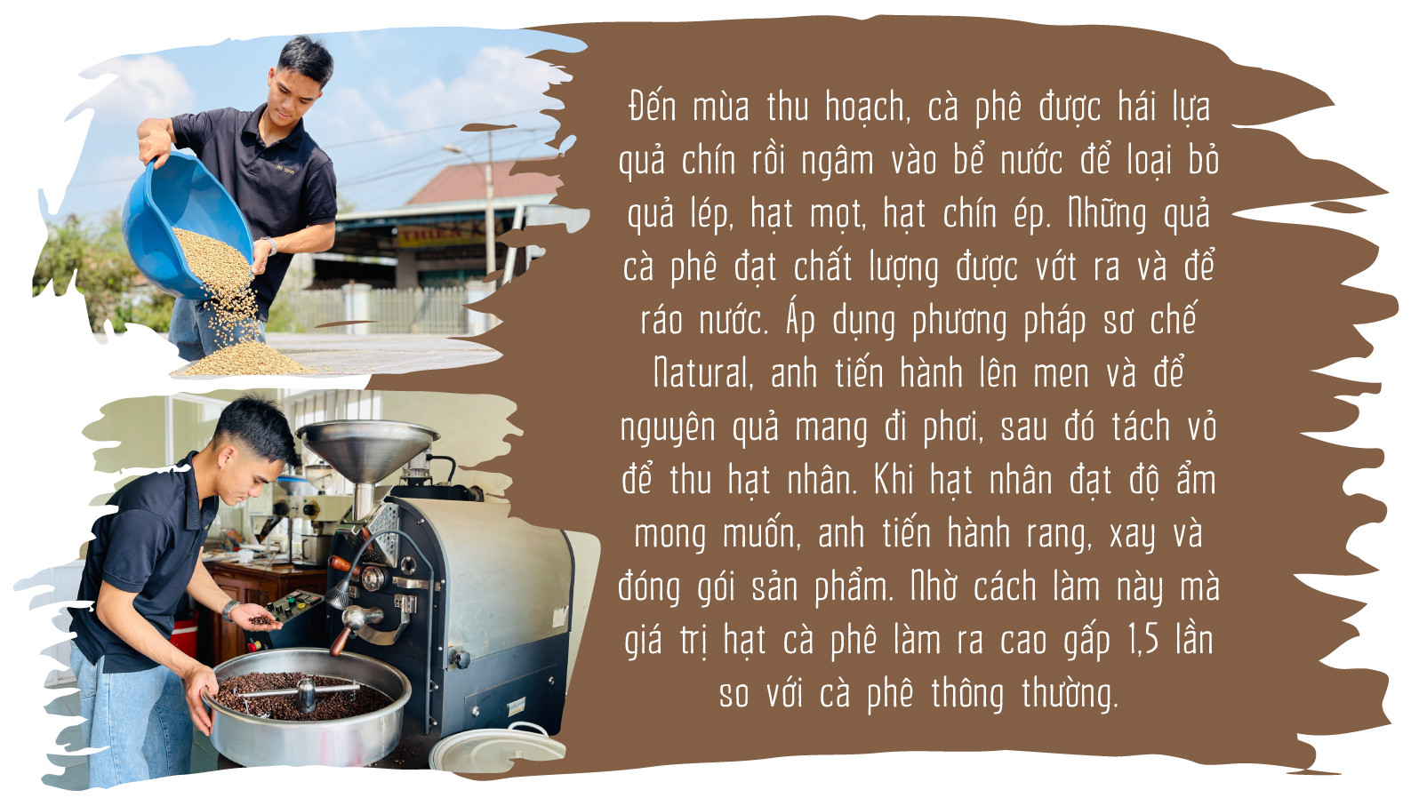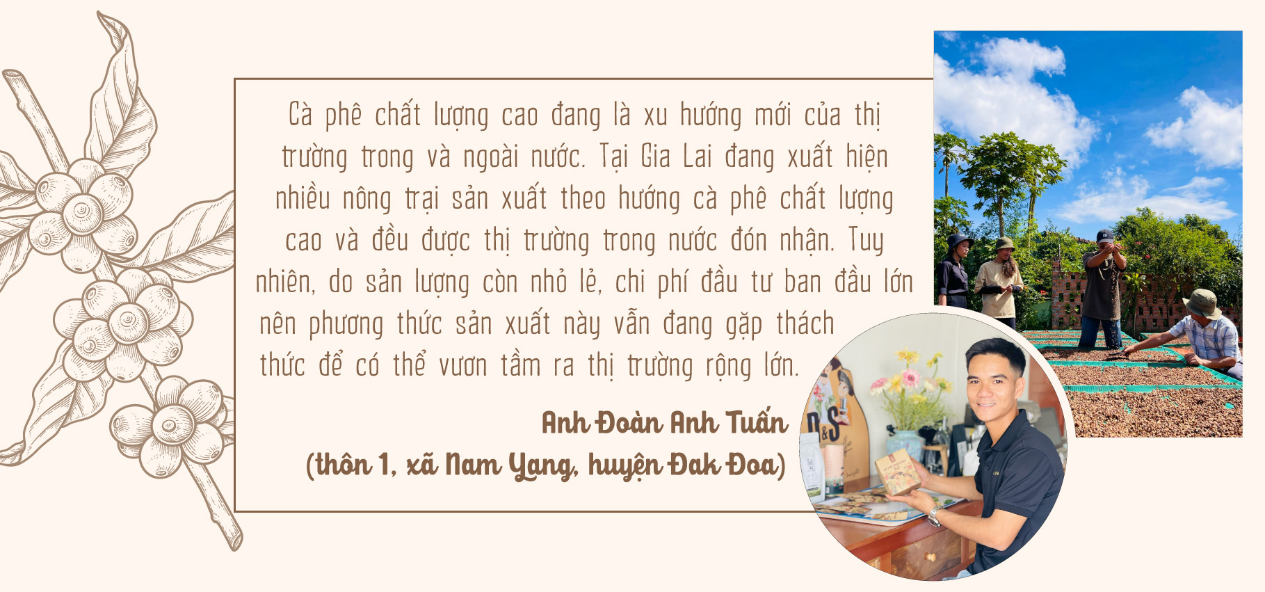 Anh Đoàn Anh Tuấn (thôn 1, xã Nam Yang, huyện Đak Đoa) bước đầu thành công với mô hình sản xuất cà phê chất lượng cao. Năm 2019, sau khi tốt nghiệp chuyên ngành Chế tạo máy (Khoa Cơ khí, Trường Đại học Bách khoa TP. Hồ Chí Minh), anh quyết định về quê nhà để xây dựng mô hình sản xuất cà phê chất lượng cao. Anh Tuấn chia sẻ: Sau khi tham quan, học hỏi kinh nghiệm tại các trang trại cà phê hữu cơ ở Lâm Đồng, Đak Lak, Đak Nông cũng như kết nối với các diễn đàn cà phê trong và ngoài nước, anh nhận thấy Gia Lai có nguồn nguyên liệu dồi dào với những vườn cà phê sản xuất theo hướng hữu cơ ngày càng nhiều. Nếu sản phẩm được chú trọng từ khâu chăm sóc đến sơ chế, chế biến sẽ tạo lợi thế cạnh tranh không chỉ về độ sạch mà còn về chi phí. Ban đầu, anh áp dụng phương pháp sản xuất này trên 4 ha cà phê của gia đình. Thay vì sử dụng phân hóa học như trước, anh dùng phân hữu cơ bón cho vườn cà phê. Đồng thời, anh chủ động sử dụng các phương pháp tự nhiên để bảo vệ vườn cây khỏi sâu bệnh chứ không dùng thuốc trừ sâu, diệt cỏ.