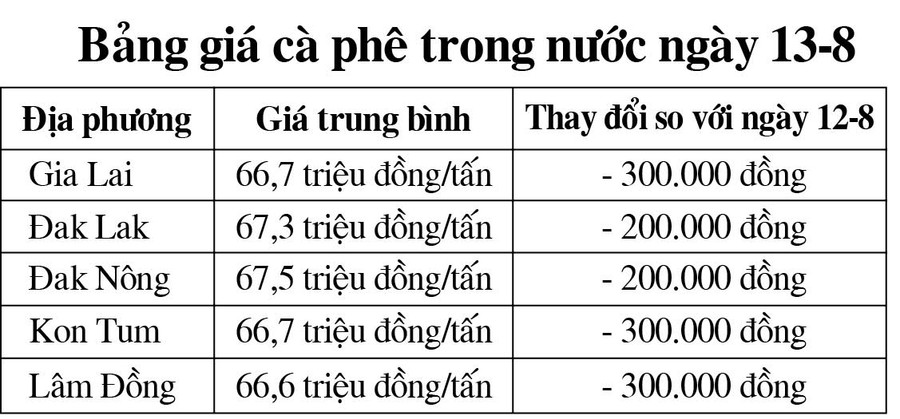 Cụ thể, sau khi giảm 300.000 đồng/tấn, giá cà phê tại tỉnh Gia Lai và Kon Tum cùng ở mức 66,7 triệu đồng/tấn.
