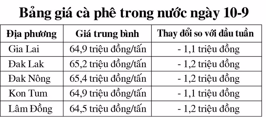 Cụ thể, sau khi giảm 1,1 triệu đồng/tấn, giá cà phê tại tỉnh Gia Lai và Kon Tum cùng ở mức 64,9 triệu đồng/tấn.