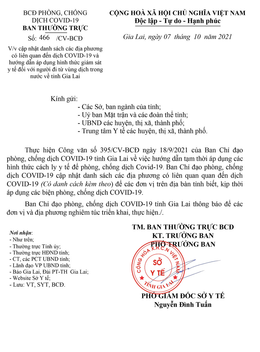 (GLO)- Ngày 7-10, Ban Chỉ đạo phòng-chống dịch Covid-19 tỉnh Gia Lai có Công văn số 466/CV-BCĐ về cập nhật danh sách các địa phương có liên quan đến dịch Covid-19 và hướng dẫn áp dụng hình thức giám sát y tế đối với người đi từ vùng dịch trong nước về tỉnh.