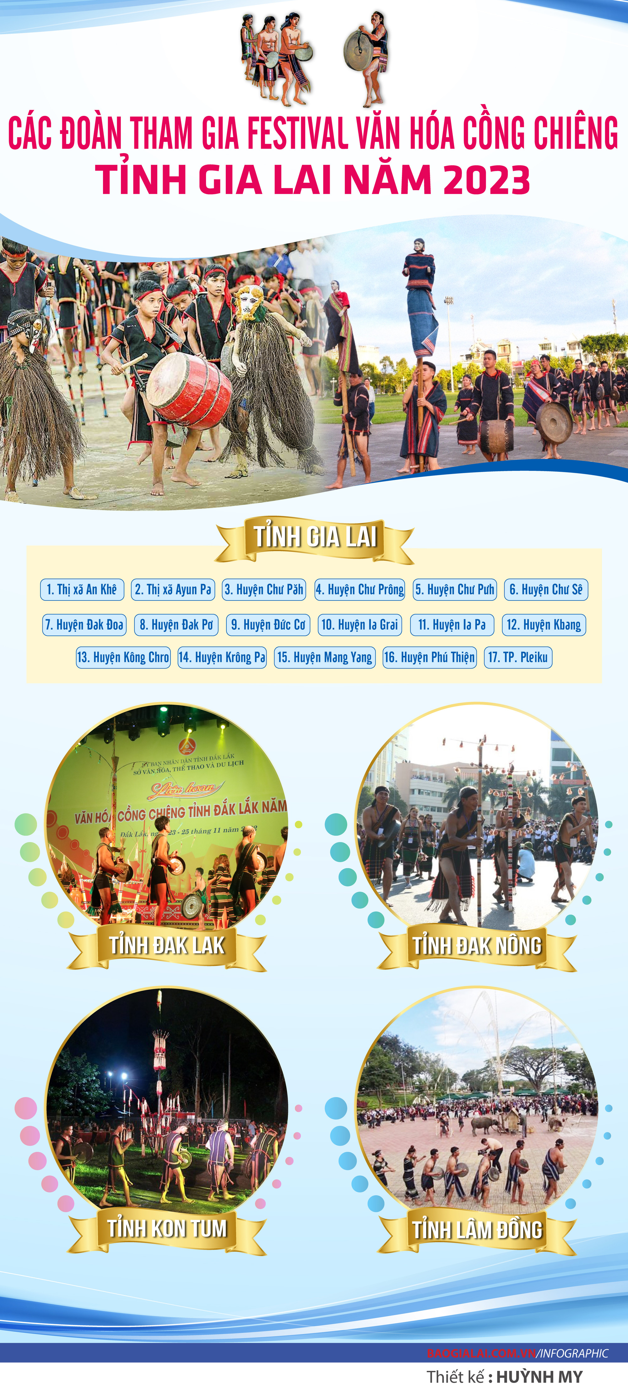 Infographic Các đoàn tham gia Festival Văn hóa cồng chiêng tỉnh Gia Lai năm 2023