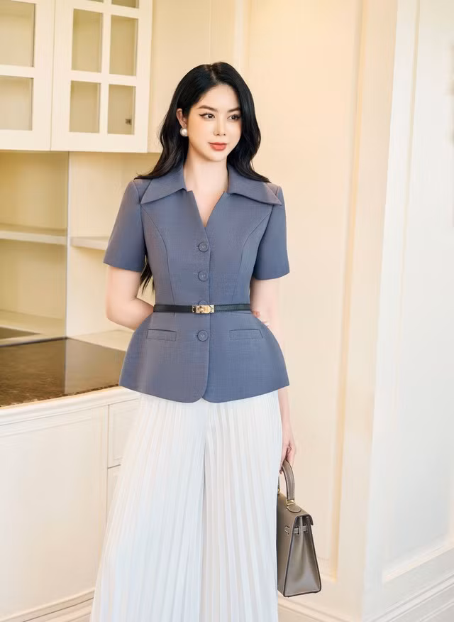 Mang đến diện mạo vừa hiện đại, vừa trẻ trung nhưng giữ vững tinh thần thanh lịch, set đồ gồm áo blazer cổ vest + quần ống rộng xếp ly sẽ là lựa chọn hoàn hảo dành cho nàng. Trên nền chất liệu tuýt si cao cấp, thiết kế cổ bẻ cùng dáng ôm body nhấn nhá hàng cúc được đính kết tỉ mỉ, kết hợp cùng chất liệu voan tơ mát mẻ và thắt lưng da dáng mảnh mặt khóa kim loại, quý cô sẽ là tâm điểm mọi sự chú ý