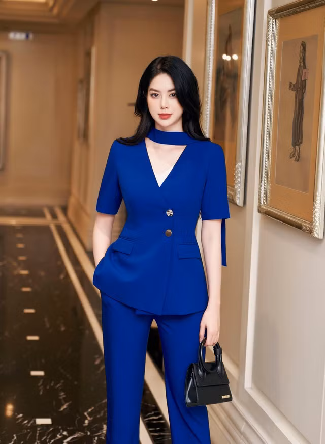 Thêm một chút năng lượng tích cực cho cả ngày dài với set đồ suit màu xanh lam tươi sáng gồm áo kiểu vest cổ chữ V đính khuy kim loại và quần âu dáng suông. Sự kết hợp của hai item này sẽ giúp nàng làm bật lên hình ảnh chỉn chu và đầy sang trọng