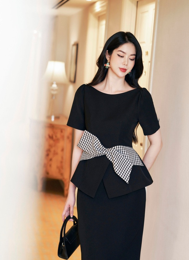 Sắc đen luôn chứa đựng vẻ đẹp huyền bí, thể hiện đa dạng những phong cách khác nhau. Và sắc đen trong combo này lại mang đến vẻ nhẹ nhàng cùng nét quý phái trong thiết kế áo vạt chéo và chân váy bút chì. Khai thác từ những chi tiết nhỏ nhất kết hợp cùng nét chấm phá đính nơ họa tiết nanh sói để hoàn thiện một thiết kế là tổng hòa của vẻ đẹp nữ tính cùng khí chất sang trọng