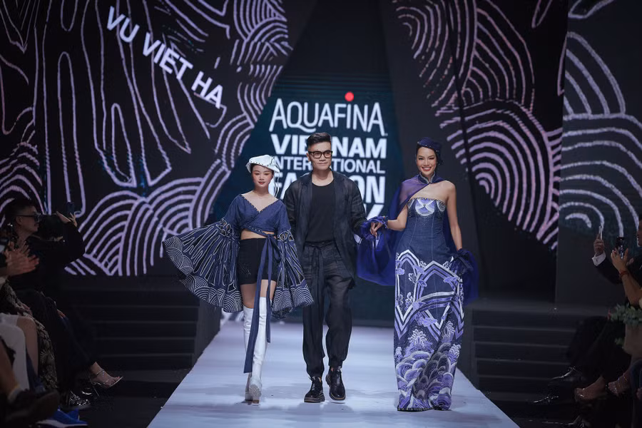 Với những hoạ tiết thuỷ ba sóng nước trên trang phục cổ Việt Nam thế kỷ 19, NTK Vũ Việt Hà đã đã khéo léo biến tấu và cách điệu hoa văn lên các thiết kế hiện đại, đủ để trang phục vẫn mới mẻ thu hút, mà không mất đi nét nguyên bản văn hoá truyền thống Việt Nam.