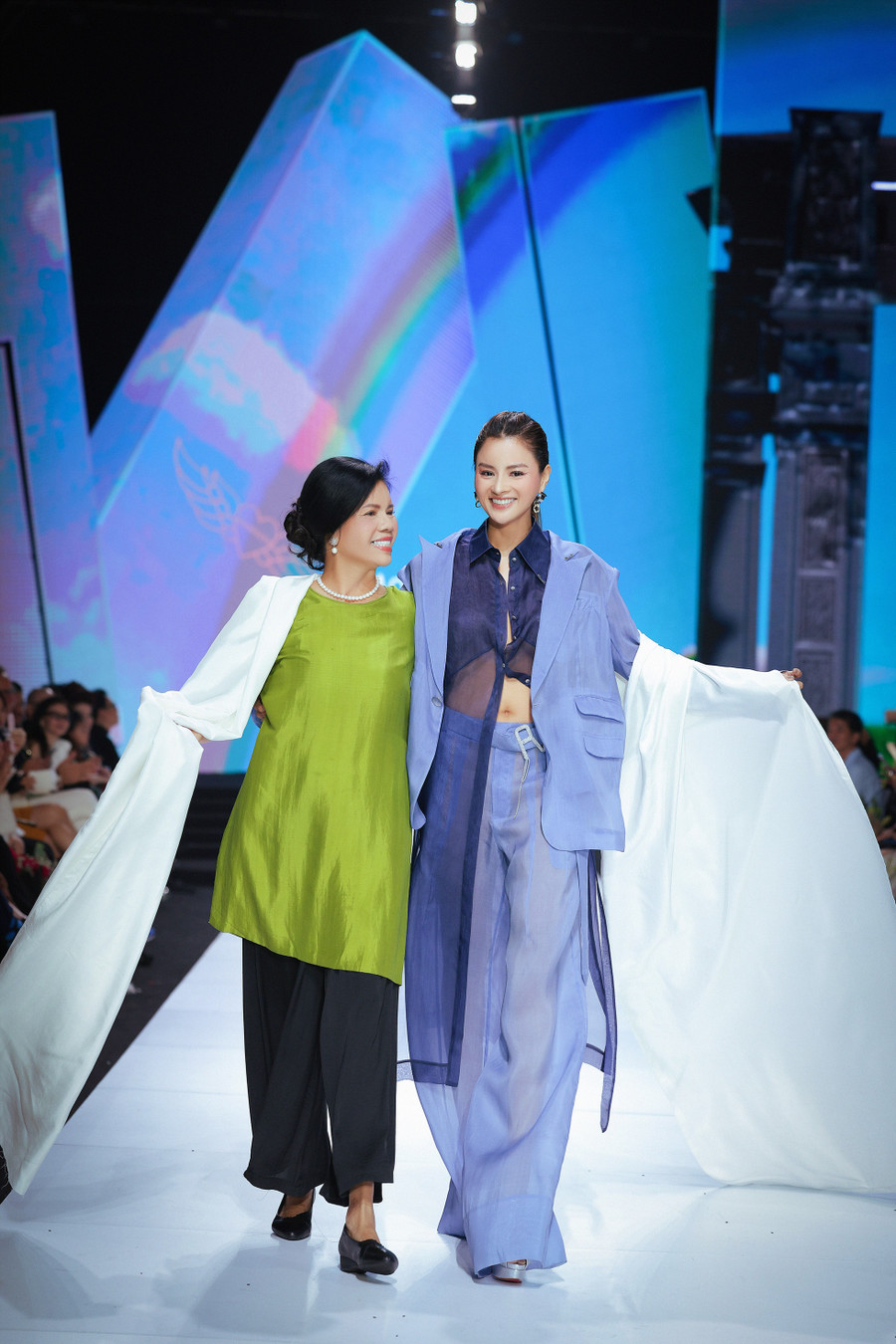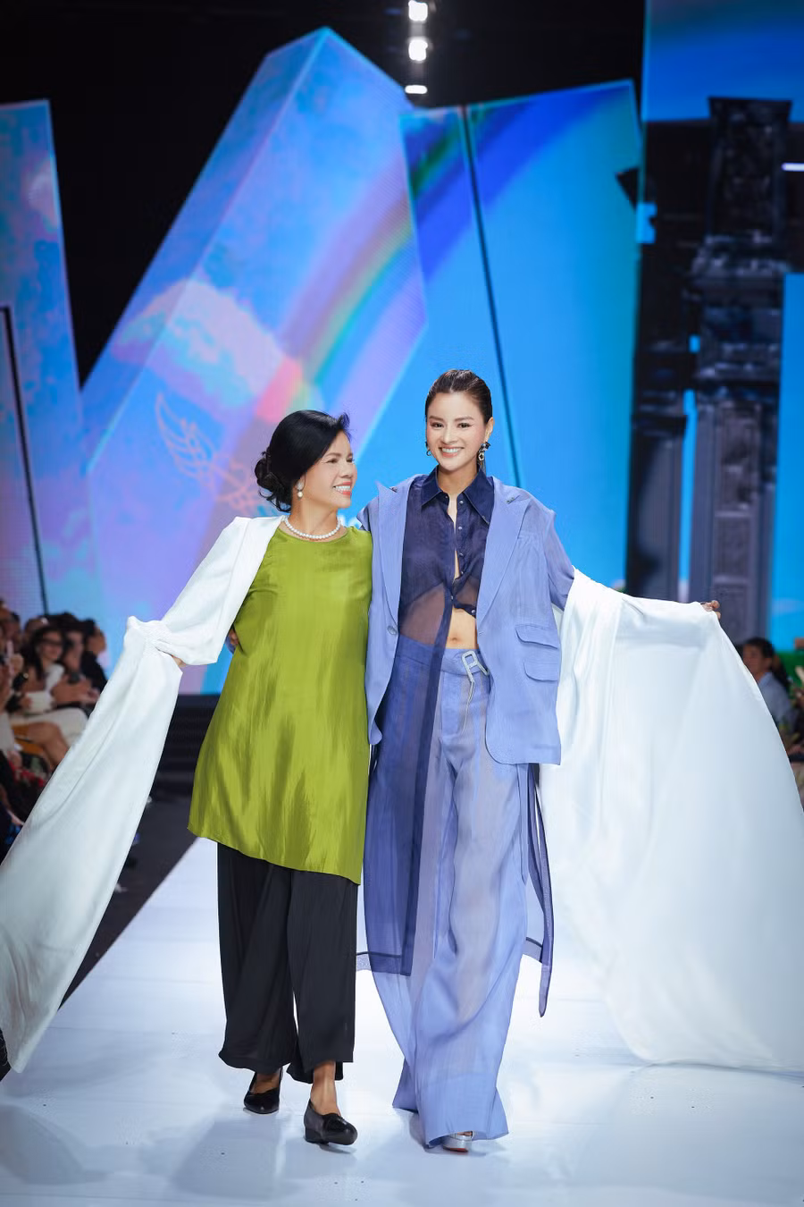 | NTK Vũ Thu Phương mang lụa lên sàn diễn với phần thể hiện của Võ Hoàng Yến, Anh Thư. |