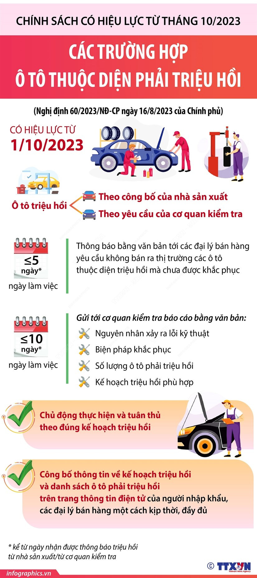 Nghị định quy định các trường hợp ôtô thuộc diện phải triệu hồi từ 1/10/2023: Ôtô triệu hồi theo công bố của nhà sản xuất và Ôtô triệu hồi theo yêu cầu của cơ quan kiểm tra.