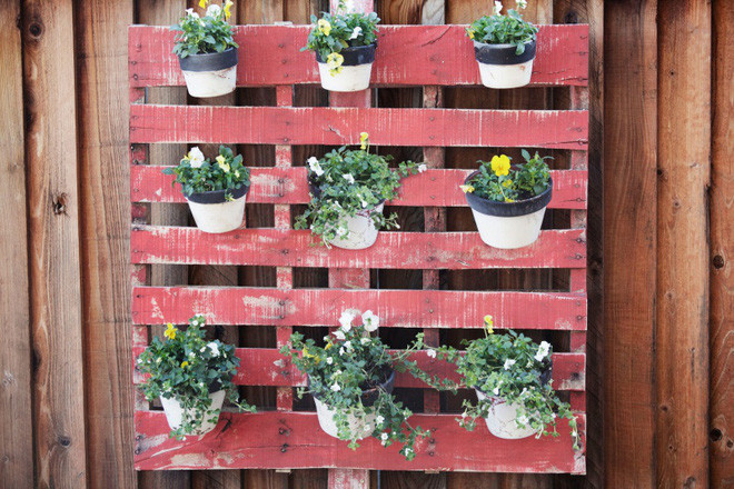 Tạo vườn đứng nhỏ xinh bằng pallet để gắn các chậu hoa lên trên.