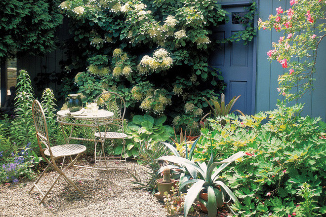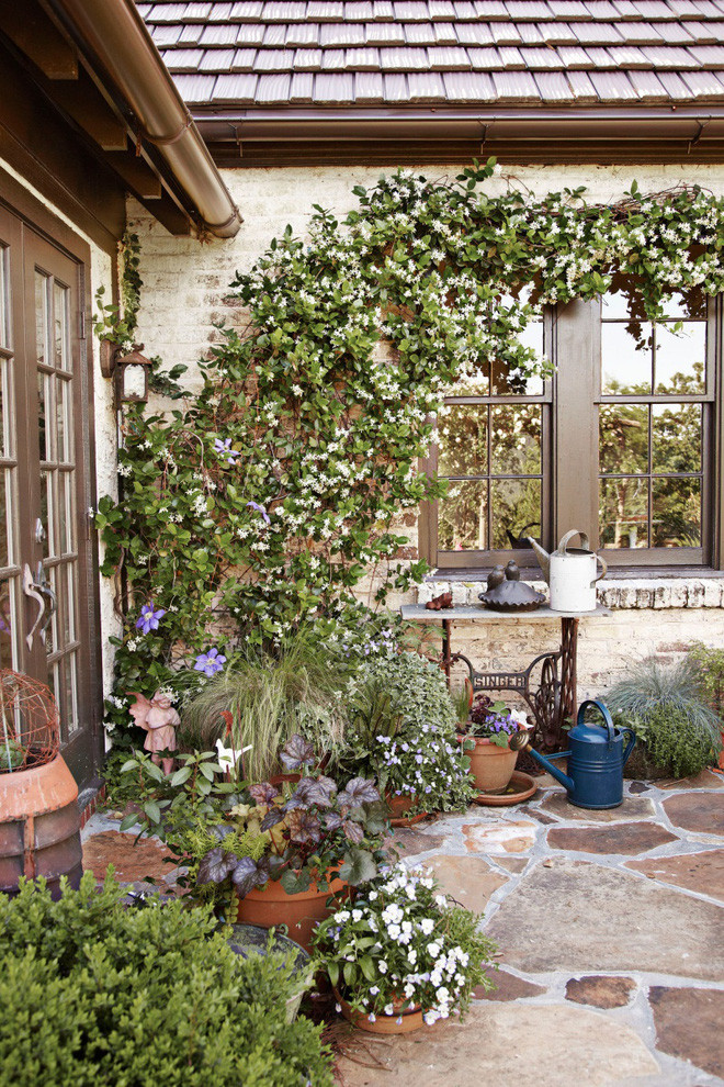 Chọn một góc sân gần khoảng tường nhà để trồng hoa leo và hoa bụi xung quanh tạo nét mới mẻ và vẻ đẹp lãng mạn.