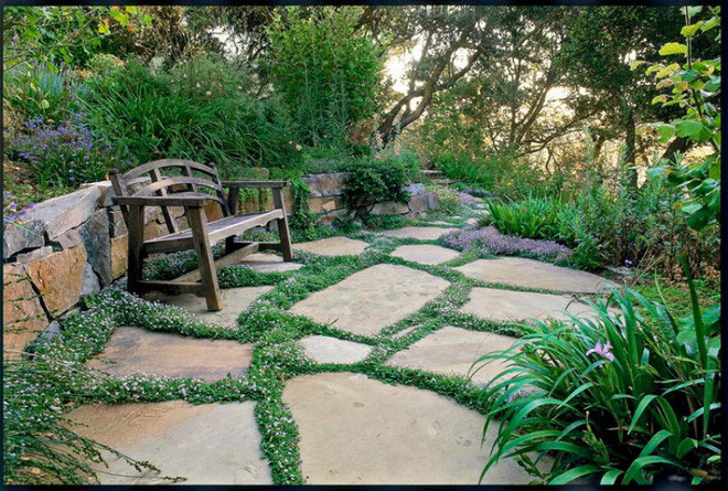 Mảnh sân đá quen thuộc được trồng cỏ hay các loài hoa bé li ti tạo đường viền ấn tượng.