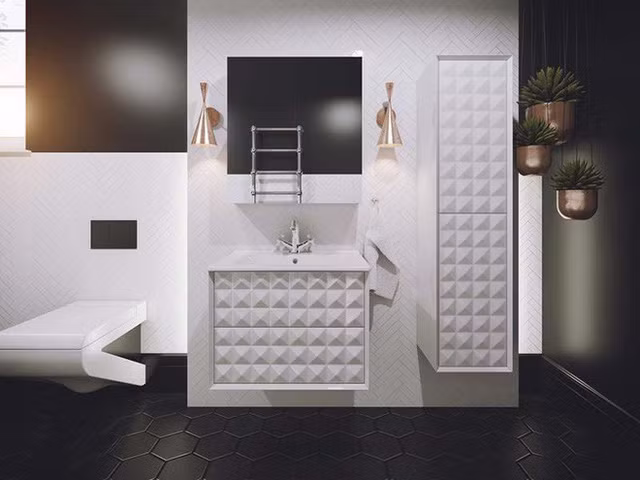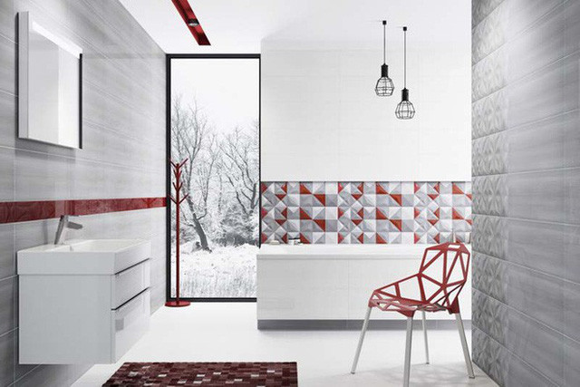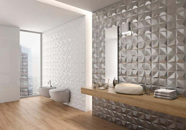 Gạch ốp 3D góp phần tăng thêm nét cuốn hút bên trong căn phòng tắm đơn giản, mộc mạc.