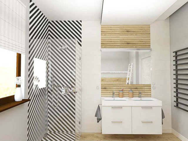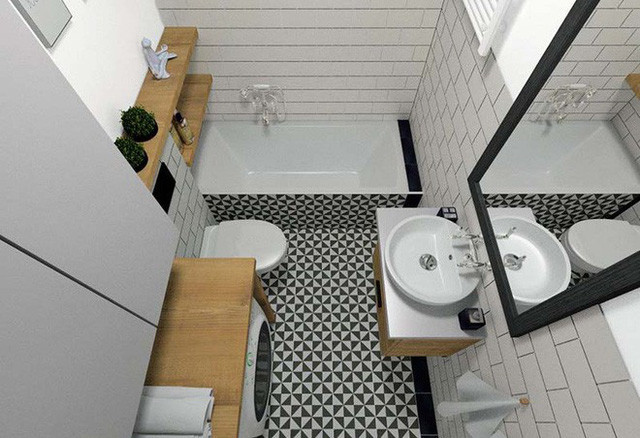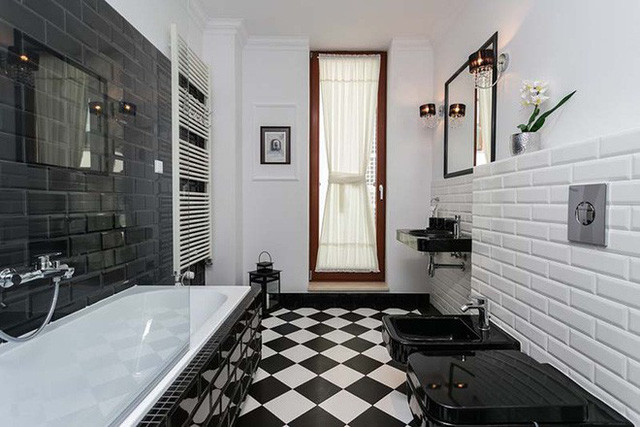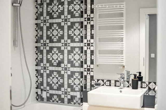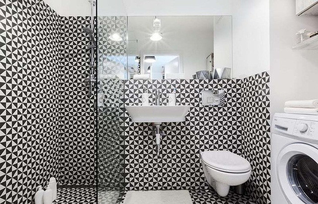 Bức tường phòng tắm với những họa tiết đen – trắng khiến bạn không thể rời mắt.