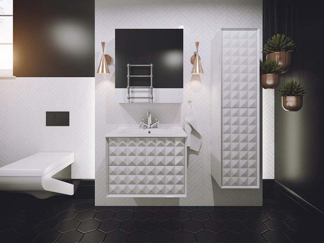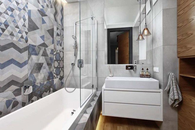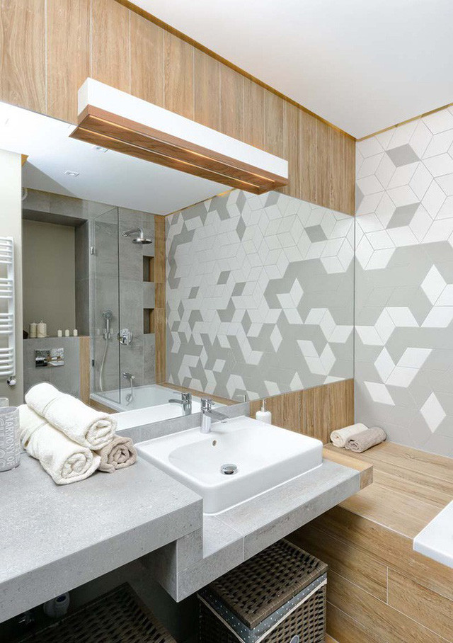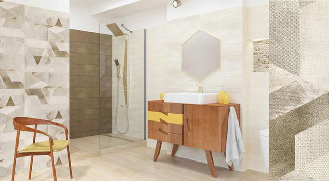 Không chỉ sử dụng mẫu gạch ốp họa tiết bắt mắt, các sản phẩm nội thất hay phụ kiện gương trang trí của phòng tắm cũng được lựa chọn dựa trên cảm hứng hình học.