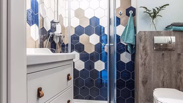 Gạch ốp tường hình lục giác với sự kết hợp của nhiều loại màu sắc giúp căn phòng tắm trông hết sức nổi bật.